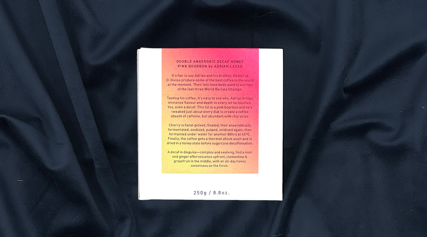 Cherry is hand-picked, floated, then anaerobically fermented, oxidised, pulped, oxidised again, then fermented under water for another 80hrs at 40°C. Finally, the coffee gets a thermal shock wash and is dried in a honey state before sugarcane decaffeination.