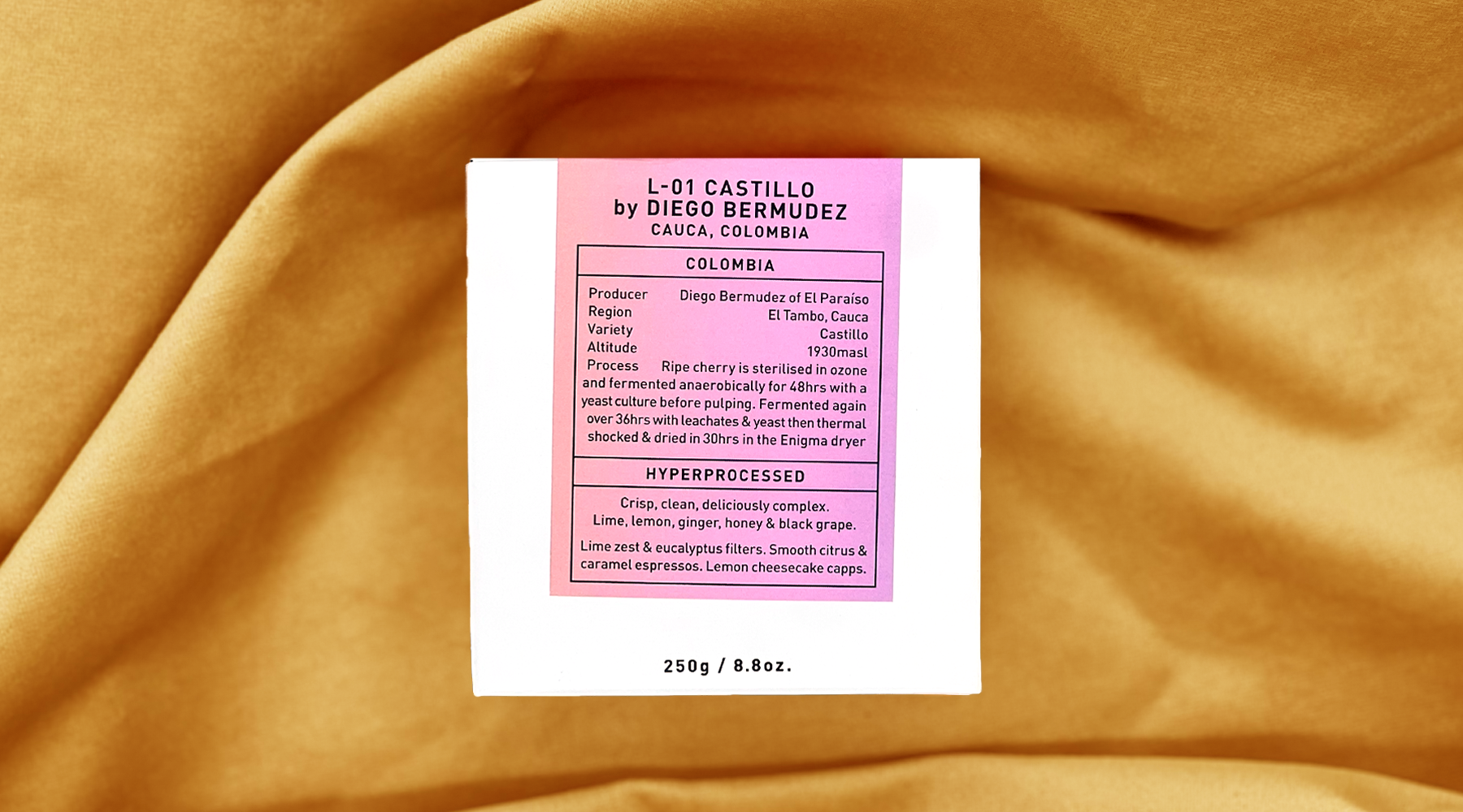 Ripe Castillo cherries are hand harvested, sterilised with ozone and fermented anaerobically for 48hrs with a yeast culture before pulping. They're then fermented again for 36hrs with yeast and leachates collected during the first ferment, followed by Diego's signature thermal shock wash. Coffee is then dried in the Eco-Enigma, a dehumidifier dryer Diego and his team designed and built that dries by recirculating low humidity air at a stable temperature.
