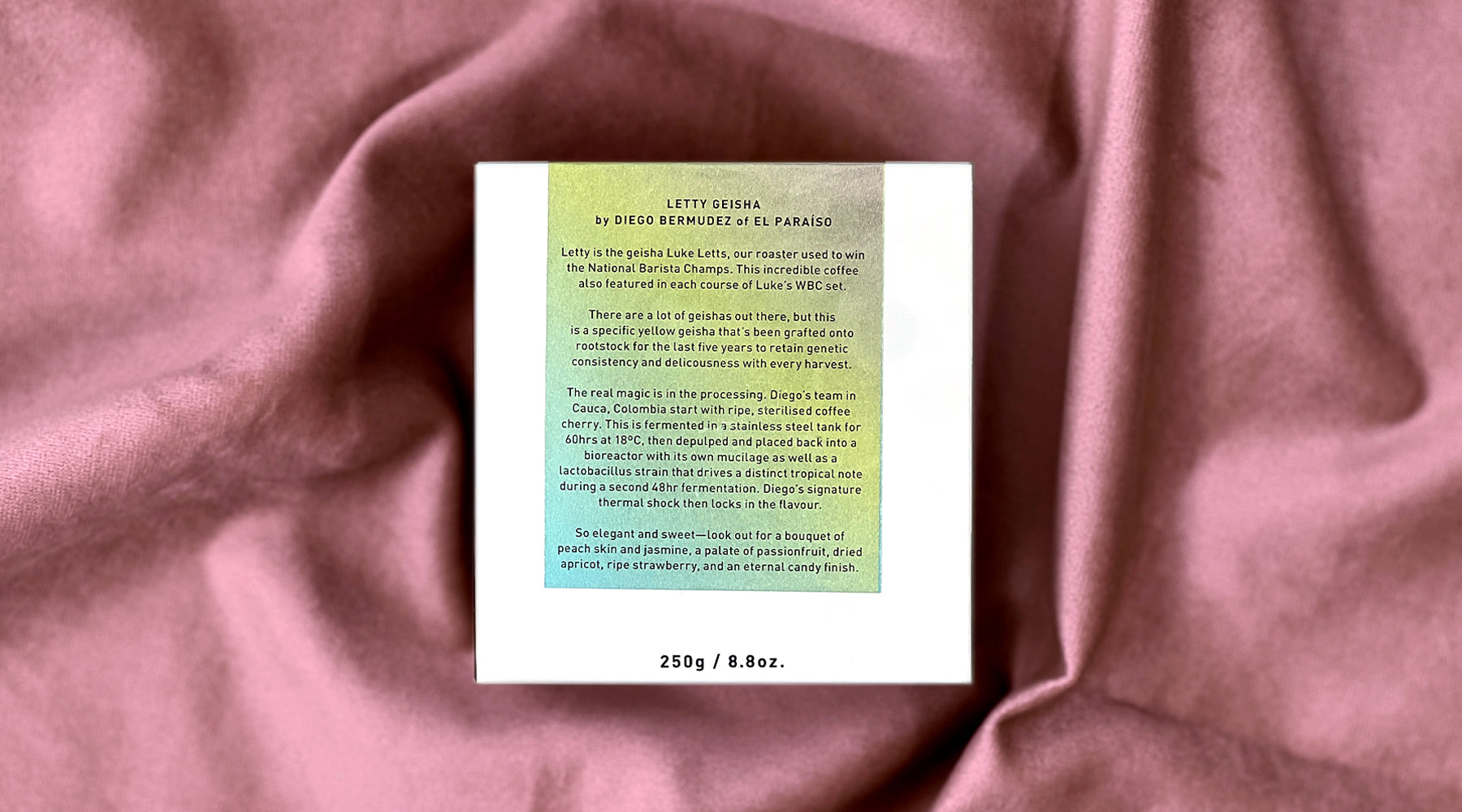 Letty is the geisha Luke Letts, our roaster used to win the National Barista Champs. This incredible coffee also featured in each course of Luke's WBC set.